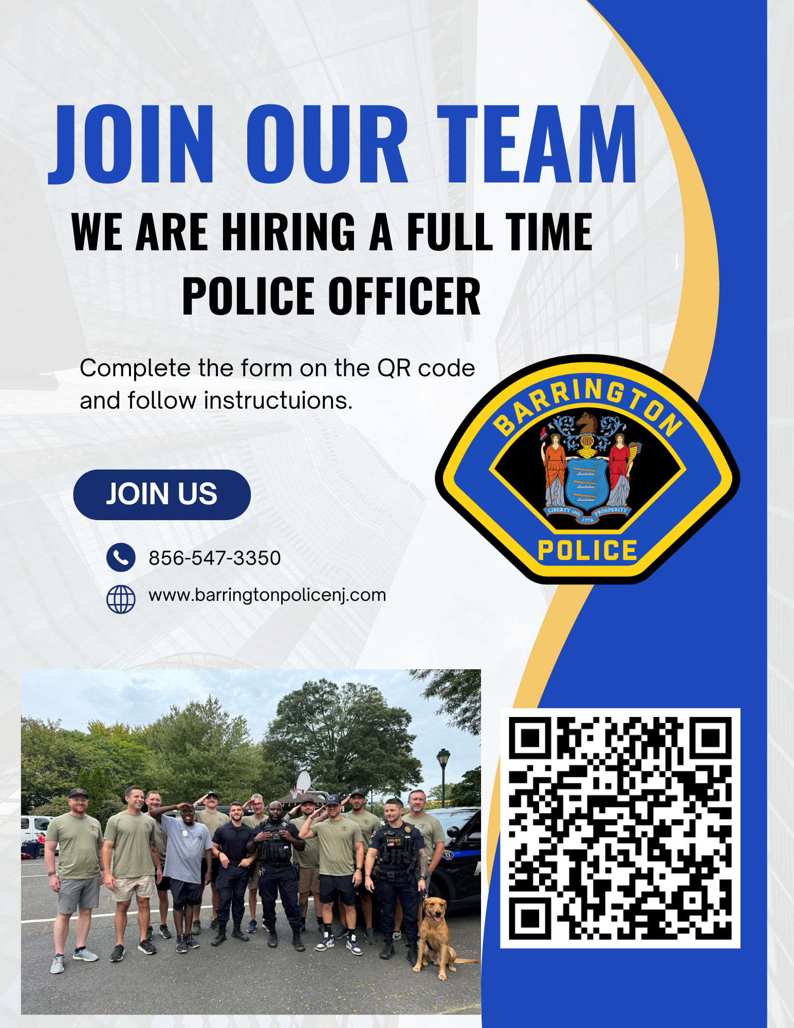 Home WE ARE HIRING! 2025 Junior Police Academy WELCOME TO OUR WEBPAGE! Protecting and serving the residents of Barrington New Jersey, since 1951. Instagram Facebook
